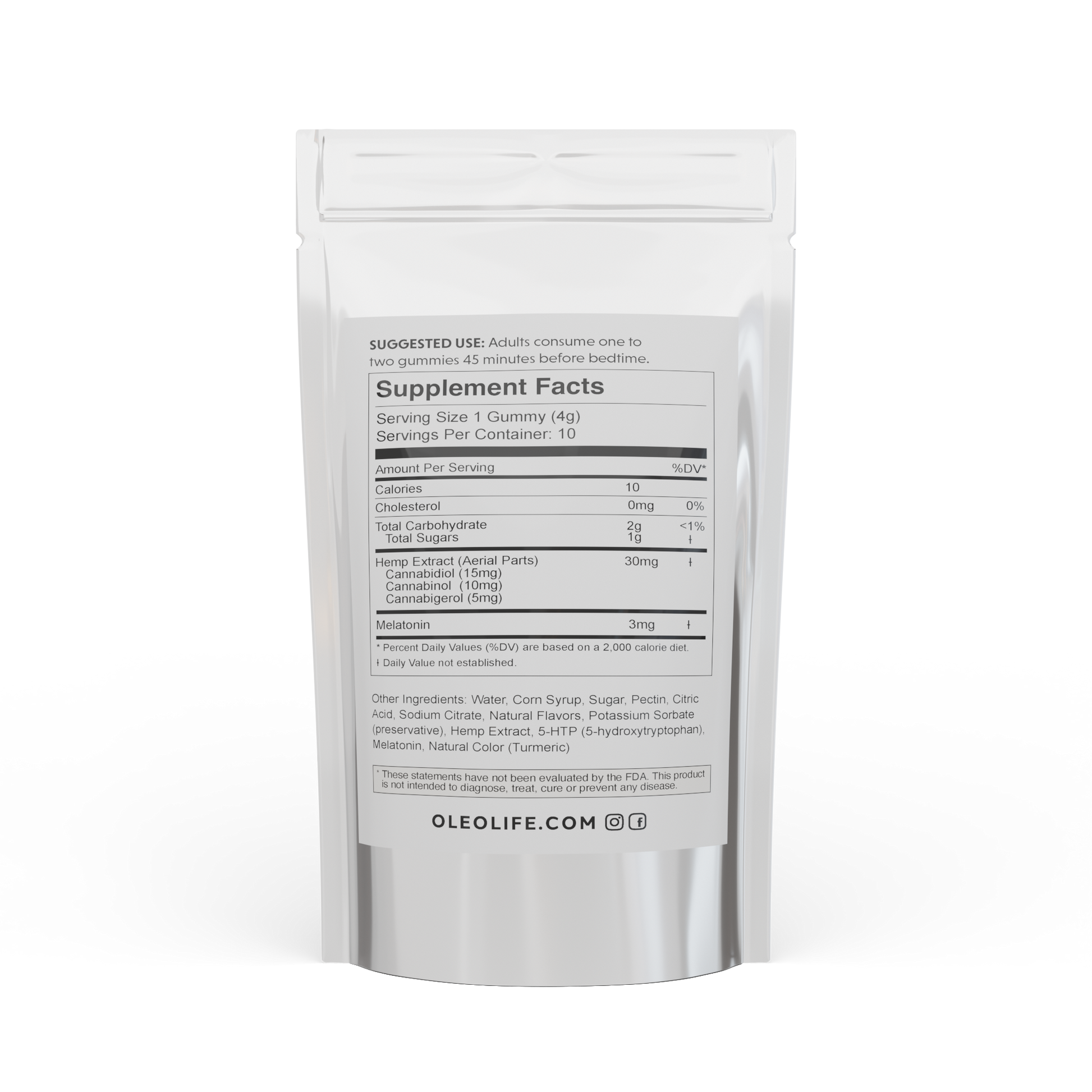 - Contain natural, functional ingredients like 3mgs of Melatonin and 10mgs of 5-HTP per gummy